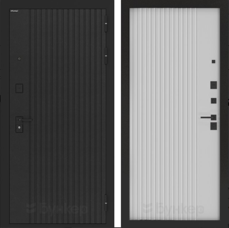 Черная матовая: Броненакладкая, сувальдные накладки со шторкой, ручка, ночник, цилиндр ключ-вертушка, глазок по центру или сбоку